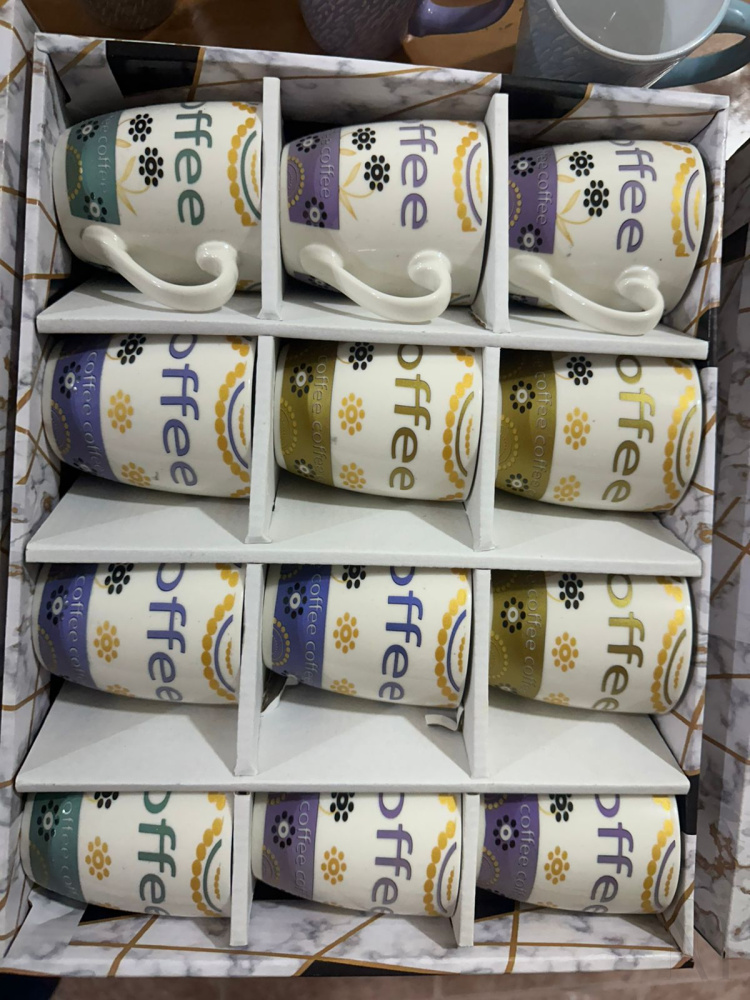 Beautiful floral ceramic mugs in blue and gold prints — perfect for coffee, tea, or everyday use.☕ Set of 12 mugs for only $10Available individually for $1.5 each