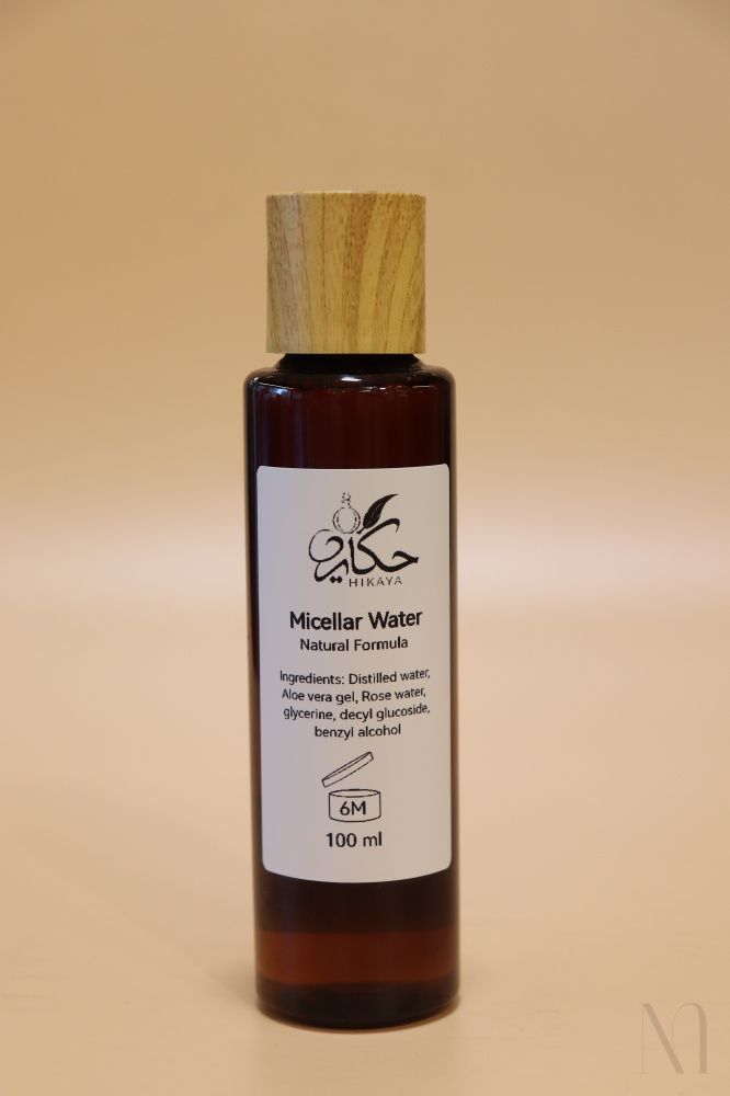 Hikaya Micellar Water, Natural Formula ingredients: Distilled Water, Aloe Vera gel, Rose Water, glycerine, Decyl Glucoside, Benzyl alcohol.